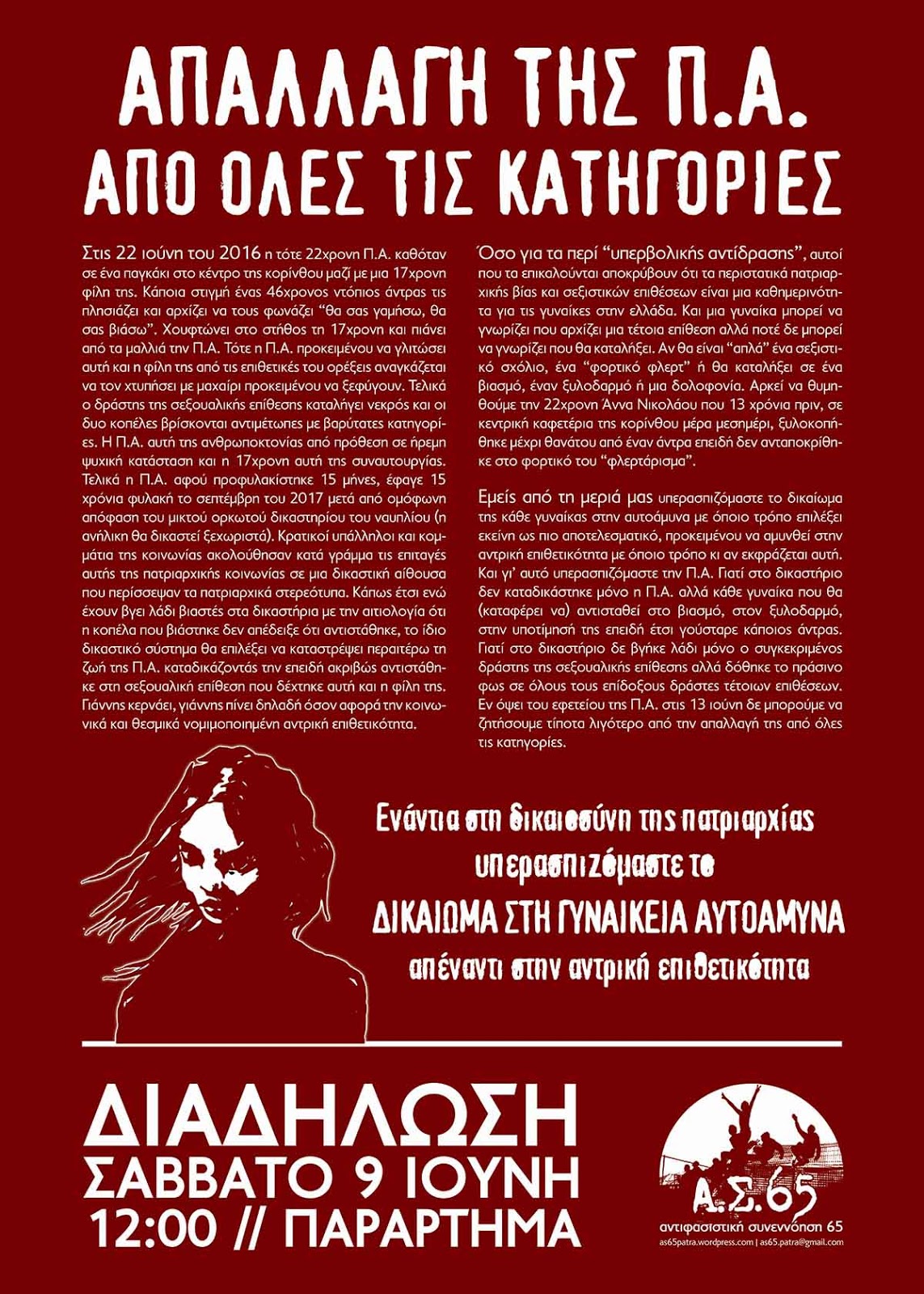 $ 0 0 Στις 13 Ιούνη στις 9:00 στο Εφετείο Ναυπλίου εκδικάζεται η υπόθεση της Π. Α. για μείωση της ποινής. αφίσα που κολλήθηκε από την Α.Σ. 65Ενάντια στη δικαιοσύνη της πατριαρχίας υπερασπιζόμαστε το δικαίωμα στη γυναικεία αυτοάμυνααπέναντι στην αντρική επιθετικότηταΔΙΑΔΗΛΩΣΗ, ΣΑΒΒΑΤΟ 9 ΙΟΥΝΗ, 12:00ΠΑΡΑΡΤΗΜΑ(Για το ίδιο ζήτημα λίγους μήνες πριν,από το antifa shalala + συντρόφισσες:)